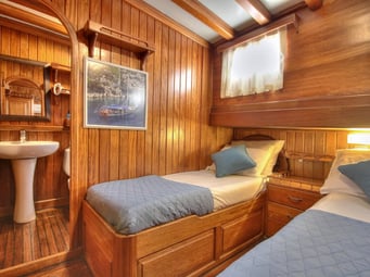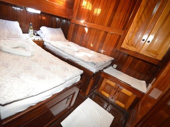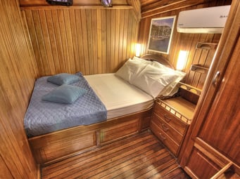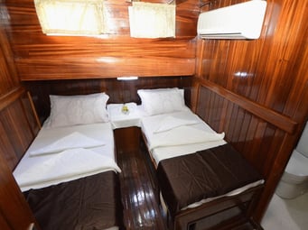 All cabins have split air conditioning and a private bathroom, including a WC and a shower cubicle.She gulet has 6 double cabins and 2 triple cabins.