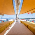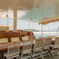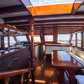 There is a spacious cushioned seating area, dining table and dining area at the rear of the boat. There is a separate dining table in saloon and your meals are prepared in a fully equipped separate kitchen. Harmonia Gulet has enough sunbathing mats and space for all guests.
