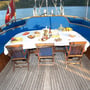 Spacious sun deck area with Sun mattresses and cushions, Sun awning, Cushioned aft deck with a large table, Deck chairs, spacious saloon with bar and dining table, Music Set, Color TV, DVD Player, Snorkel and Fishing Equipment, Fiber Dinghy with outboard engine.