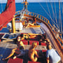 Spacious sun deck area with Sun mattresses and cushions, Sun awning, Cushioned aft deck with a large table, Deck chairs, spacious saloon with bar and dining table, Music Set, Color TV, Fiber Dinghy with outboard engine, Snorkel and Fishing Equipment, 2 Canoes, 1 Windsurfer, Water ski.